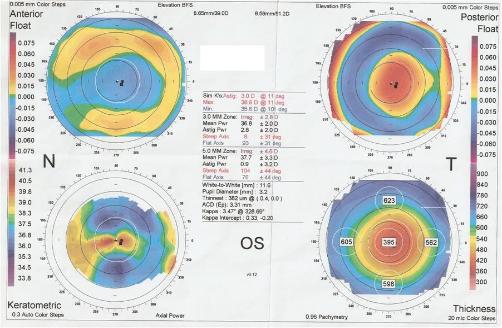 C-0.75 as 125 (VOD 1.0) en voor links S-9.25 C-0.25 as 180 (VOS 1.0). Pachymetrie